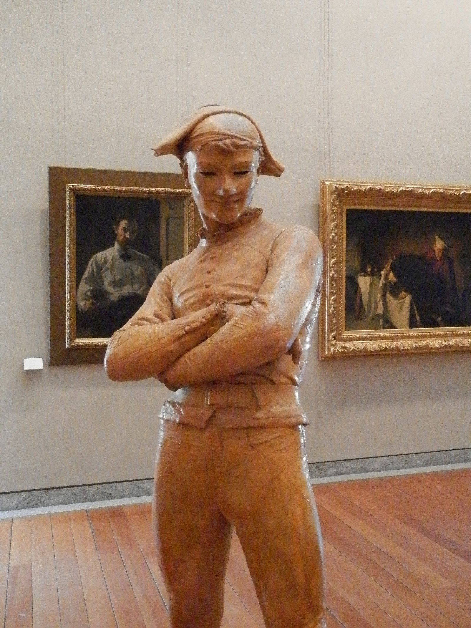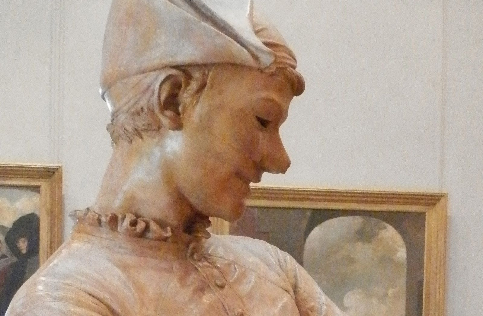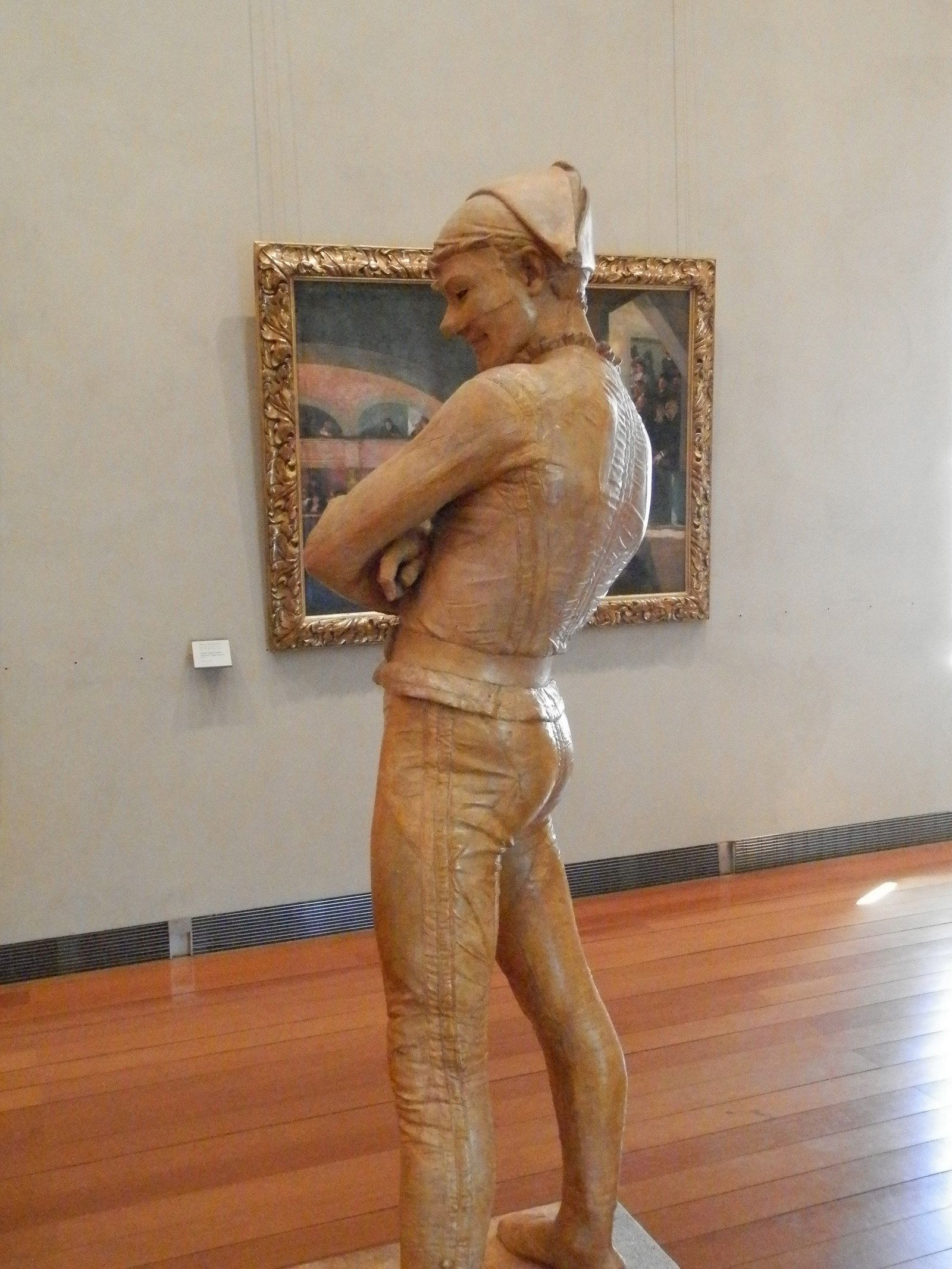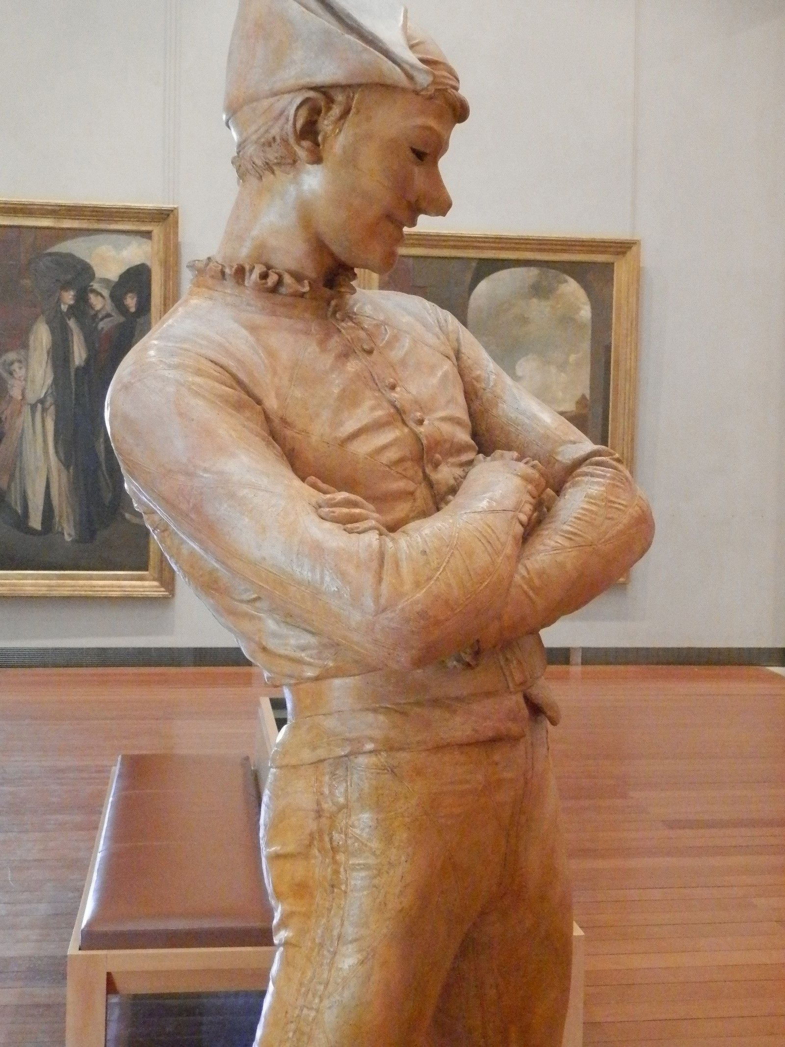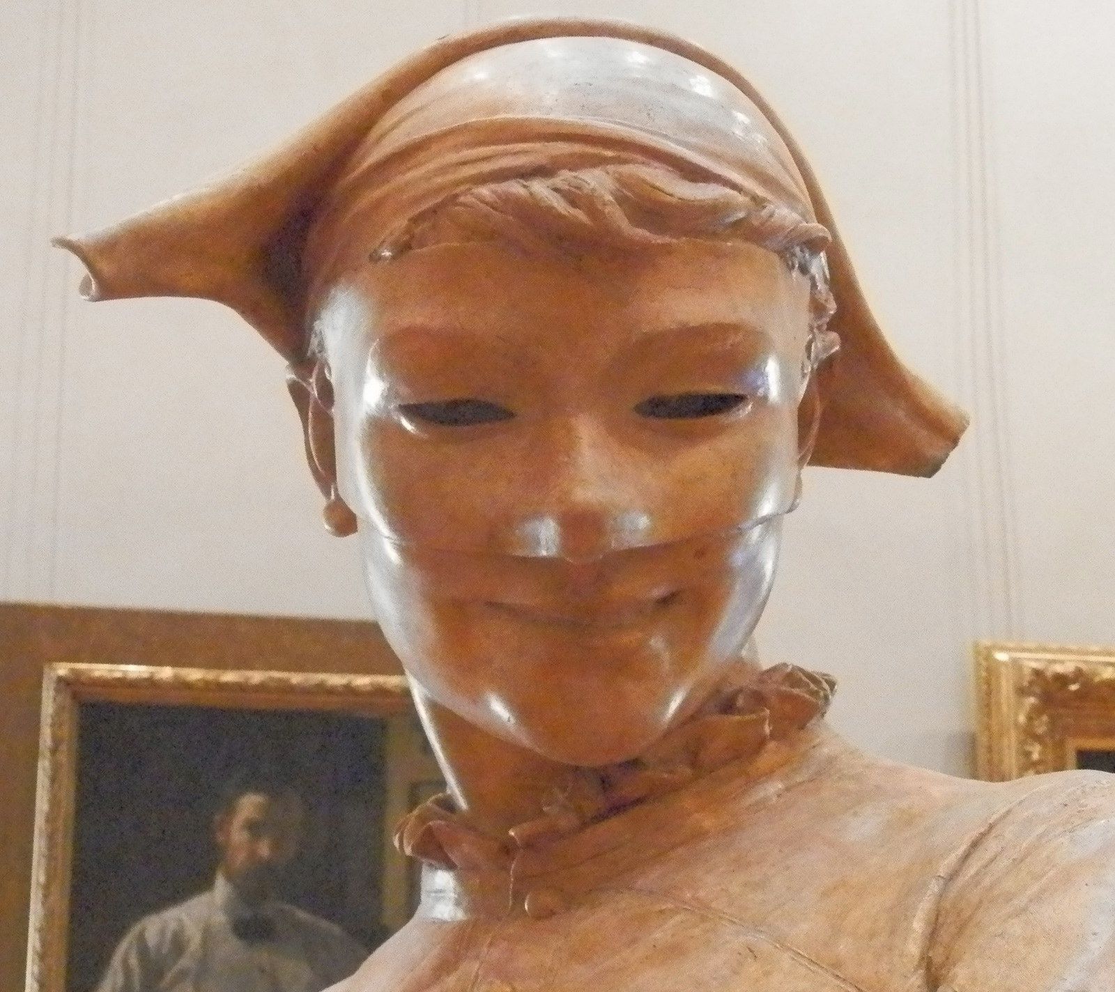 Arlequin au Musée des Beaux-arts de Lyon de René de Saint-Marceaux. Personnage incontournable de la commedia dell’arte, celui-ci a une pose espiègle regardant probablement le résultat d’un stratège pour obtenir le coeur de Colombine, bien sûr il est le concurrent de Pierrot qui finira par obtenir le cœur de cette dernière. Il ne faut pas confondre Arlequin et Polichinelle, le premier a une certaine grâce voir une élégance alors que l’autre est grossier, disgracieux et use de ruse pour arrivée à ses fins.