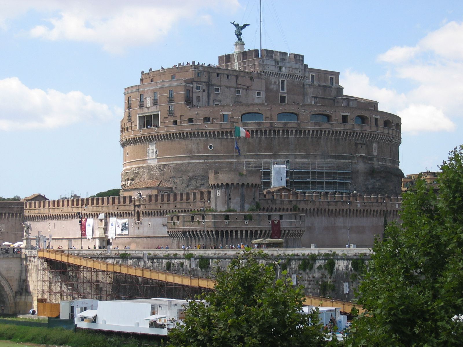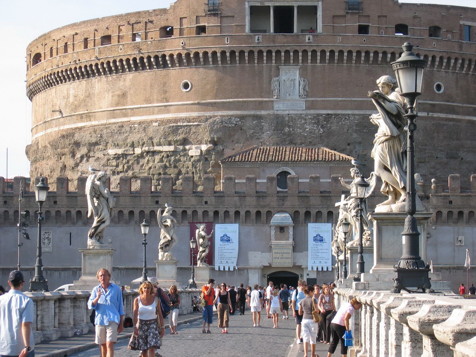 Le château St-Ange est une construction Romaine à l’origine destiné au tombeau de l’empereur Hadrien en 139. Cette construction massive de forme circulaire est loin de l’idée que l’on peut se faire de l’architecture de la Rome antique, l’absence d’arches et de colonnades lui donne une allure plus médiévale que romaine. Le mausolée d’Hadrien aura par la suite plusieurs vocations, bastion militaire, prison, palais, forteresse et même fut le refuge des Papes pour redevenir une prison jusqu’au 19ième siècle et finalement un musée jusqu’à nos jours.