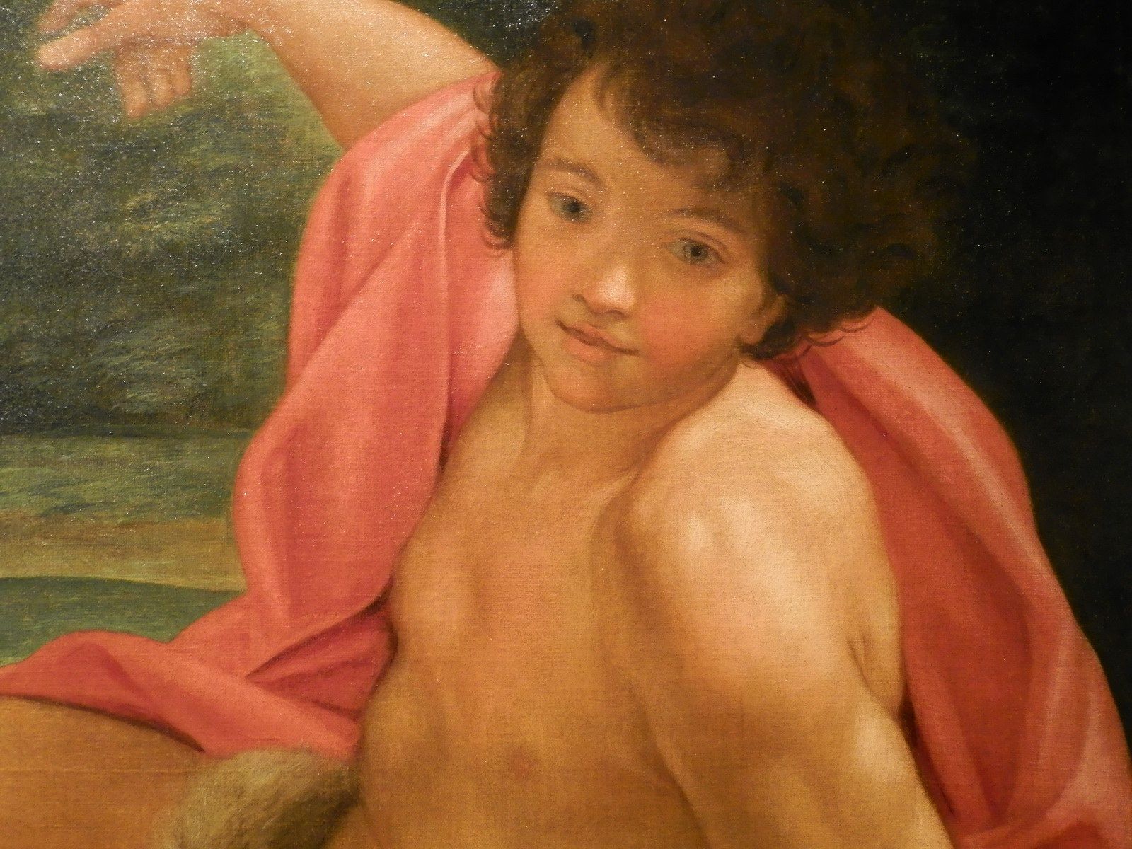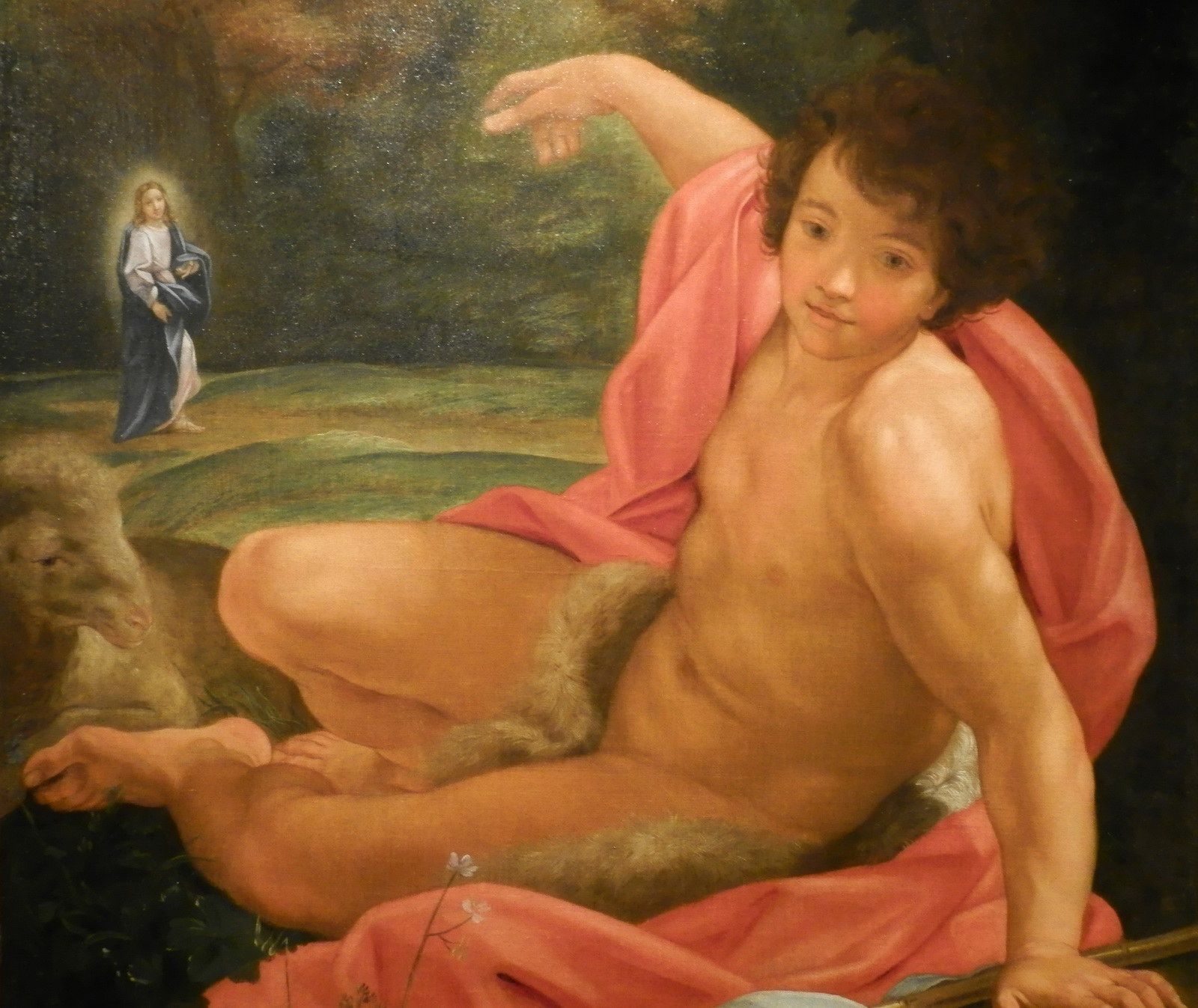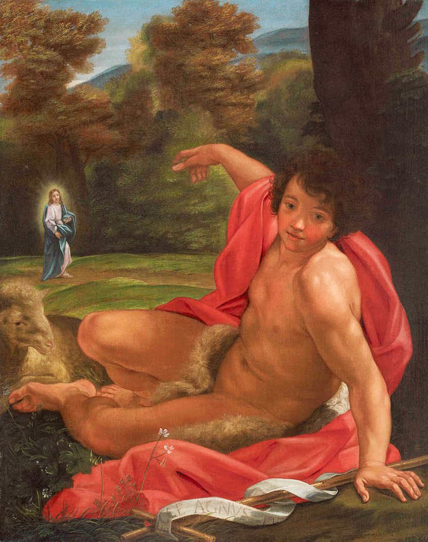 Ecce Agnus Dei de Giovanni Battista Gaulli, dit Baciccio, vers 1695-1700. Cette oeuvre illustre un très jeune Saint Jean-Baptiste pointant le Christ directement plutôt que l’agneau de la parabole. Protégé du Bernin, Gaulli devient un des peintres les plus courus de Rome. Dans les dernières années de sa vie, Gaulli utilise une palette plus pastel, moins vibrante pour plaire à la vague rococo adoptée par les Romains de l’époque. L’absence d’une perspective sentie fait que le Christ a presque l’apparence d’un être miniature, même d’un ajout au tableau après coup et l’agneau semble intégré au paysage.