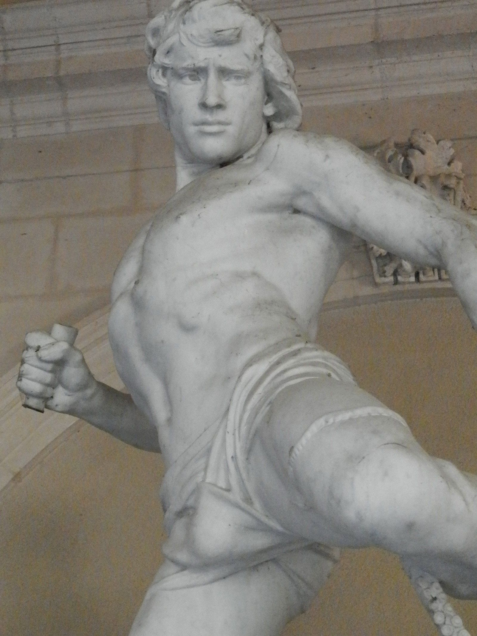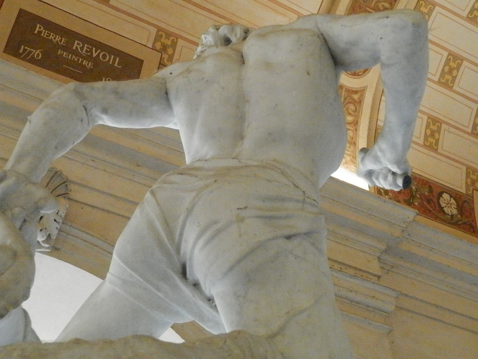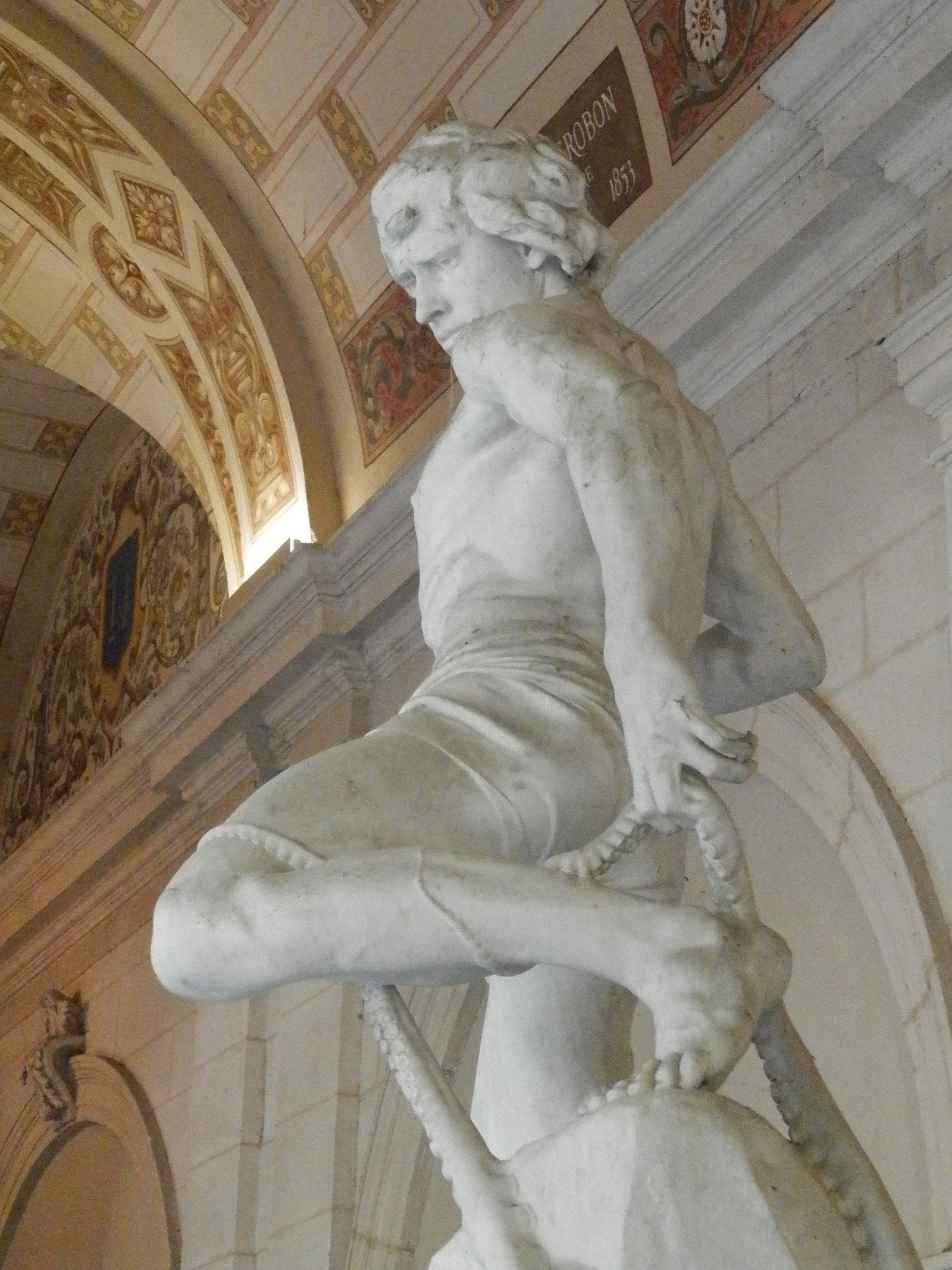En fait si Gilliatt n’est pas apprécier des gens et que les filles ne le trouvent pas beau… il est très beau en réalité, assurément dans cette statue de Carlier. Un visage bizarrement hollywoodien, est-ce à Robert Redford qu’il me fait penser? Sa carrure musclée en position de démonstration de force, cambré pour se défaire des ventouses de la pieuvre offre une sensation à la fois sensuelle et rustre, une image de masculinité et de robustesse.
