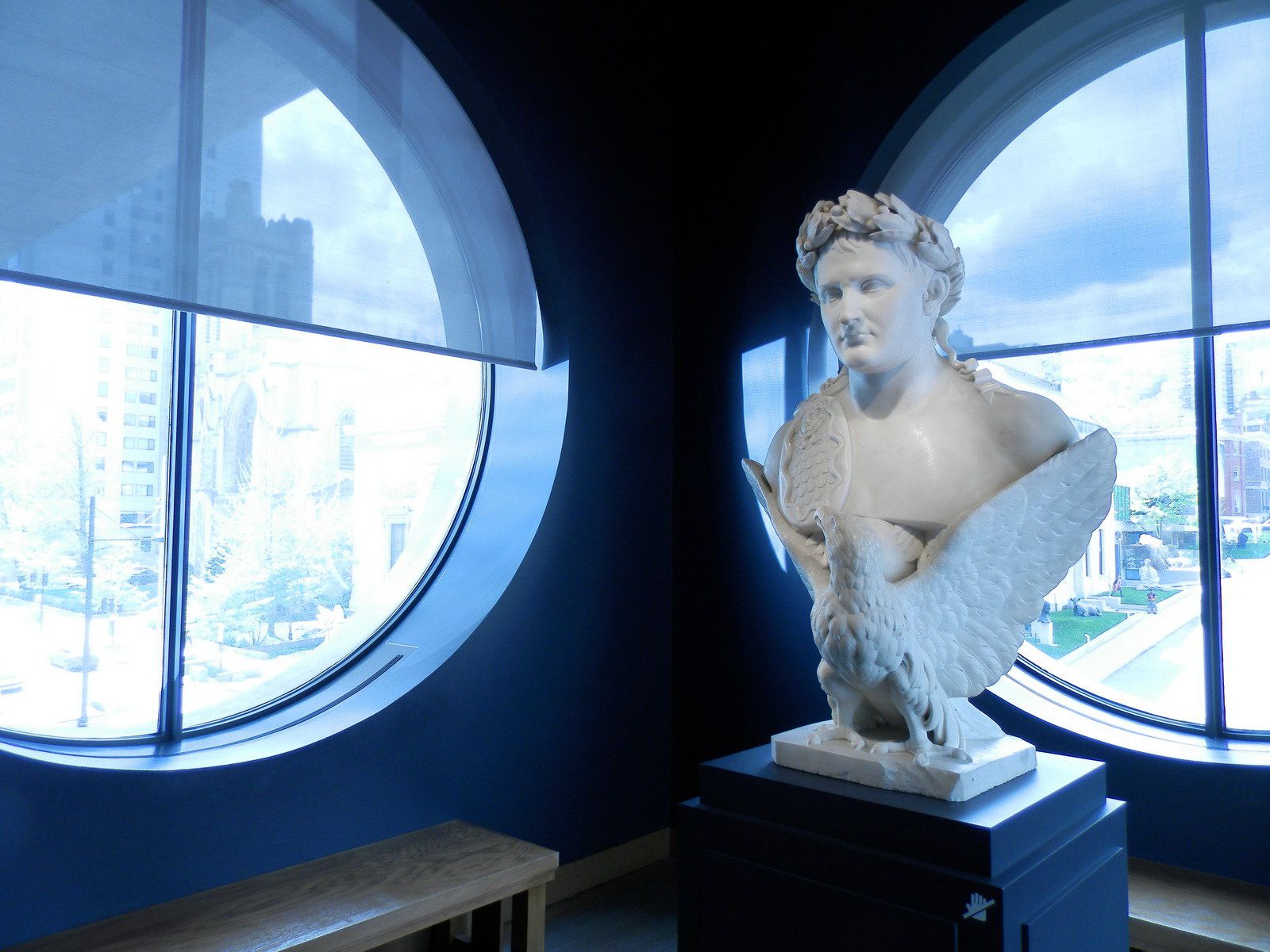 Ce magnifique buste de Napoléon Bonaparte de la collection Ben Weider au MBAM est positionné au centre d’une des colonnades frontales du musée des Beaux-Arts de Montréal, ce qui lui offre un environnement particulier de bâtiments urbains contemporain vu de lucarnes modernes sortant le buste de son environnement muséal traditionnel. Le regard solennel de l’empereur dans ce qui pourrait sembler un autel moderne donne un sentiment rétro-futuriste de ce que pourrait être la place de Napoléon s’il n’était pas tombé à partir de la guerre de 1812. Aurait-il été l’empereur de tous? Probablement pas, car tout a un point de chute, même pour les plus grands et puissant, d’Agamemnon à Napoléon 1er… c’est l’ordre des choses.