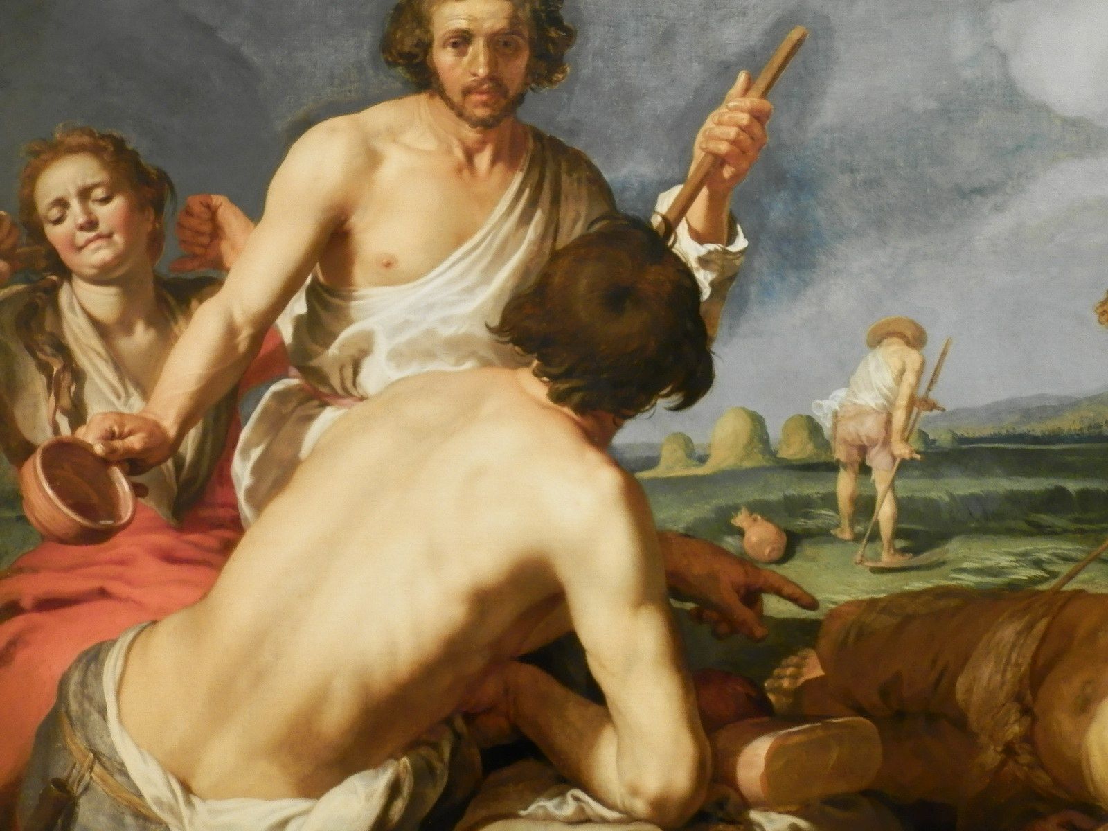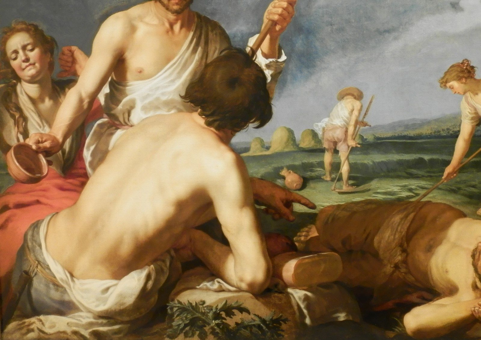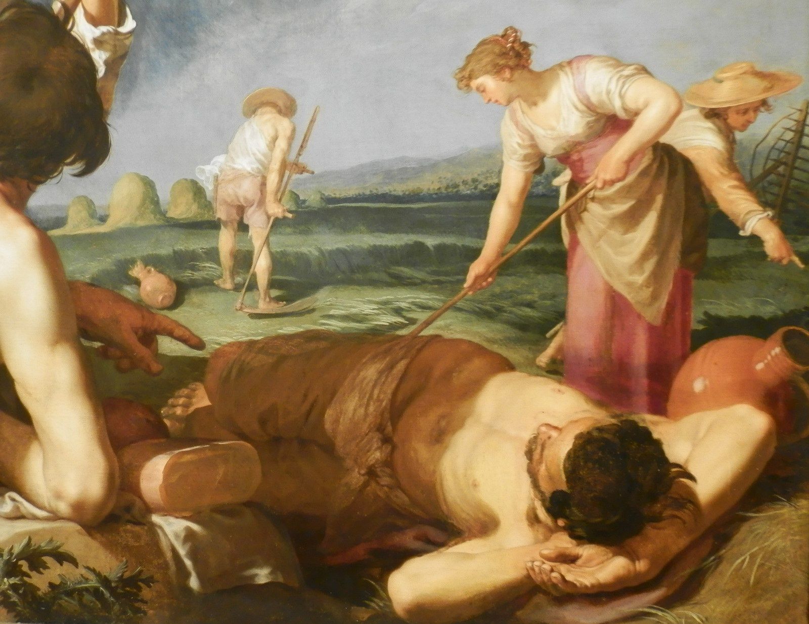 Rentrée de la moisson d’Abraham Bloemaert, vers 1625-1630. D’abord maniériste évoluant vers le classicisme, ce peintre hollandais eut une période caravagesque suite au contact à ce style vers 1620. Ce tableau issu de sa transition vers le classicisme contient des éléments toujours influencés par Le Caravage. Malgré l’absence clair-obscur de cette oeuvre, la lumière en plongée sur cette femme rehausse les traits et les rondeurs de son visage rappelant le style caravagesque qui met en évidence les défauts de ses sujets, malgré leur grande beauté dans certains cas, augmentant le réalisme de leur physionomie.