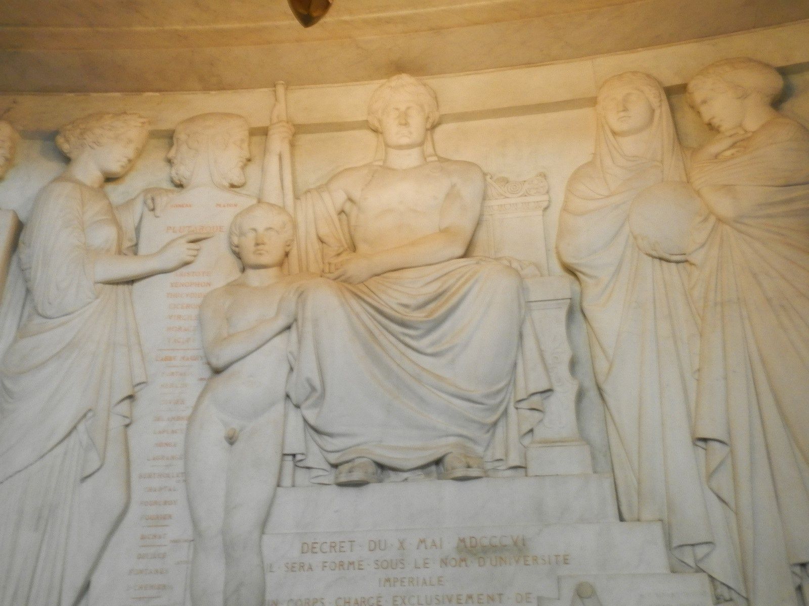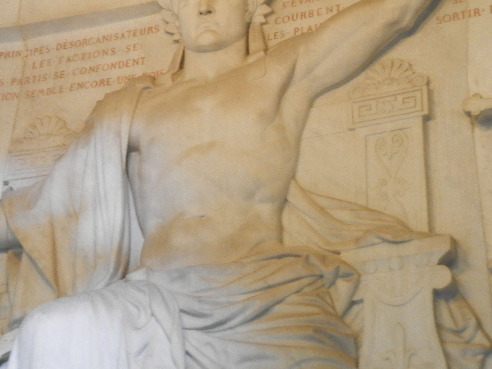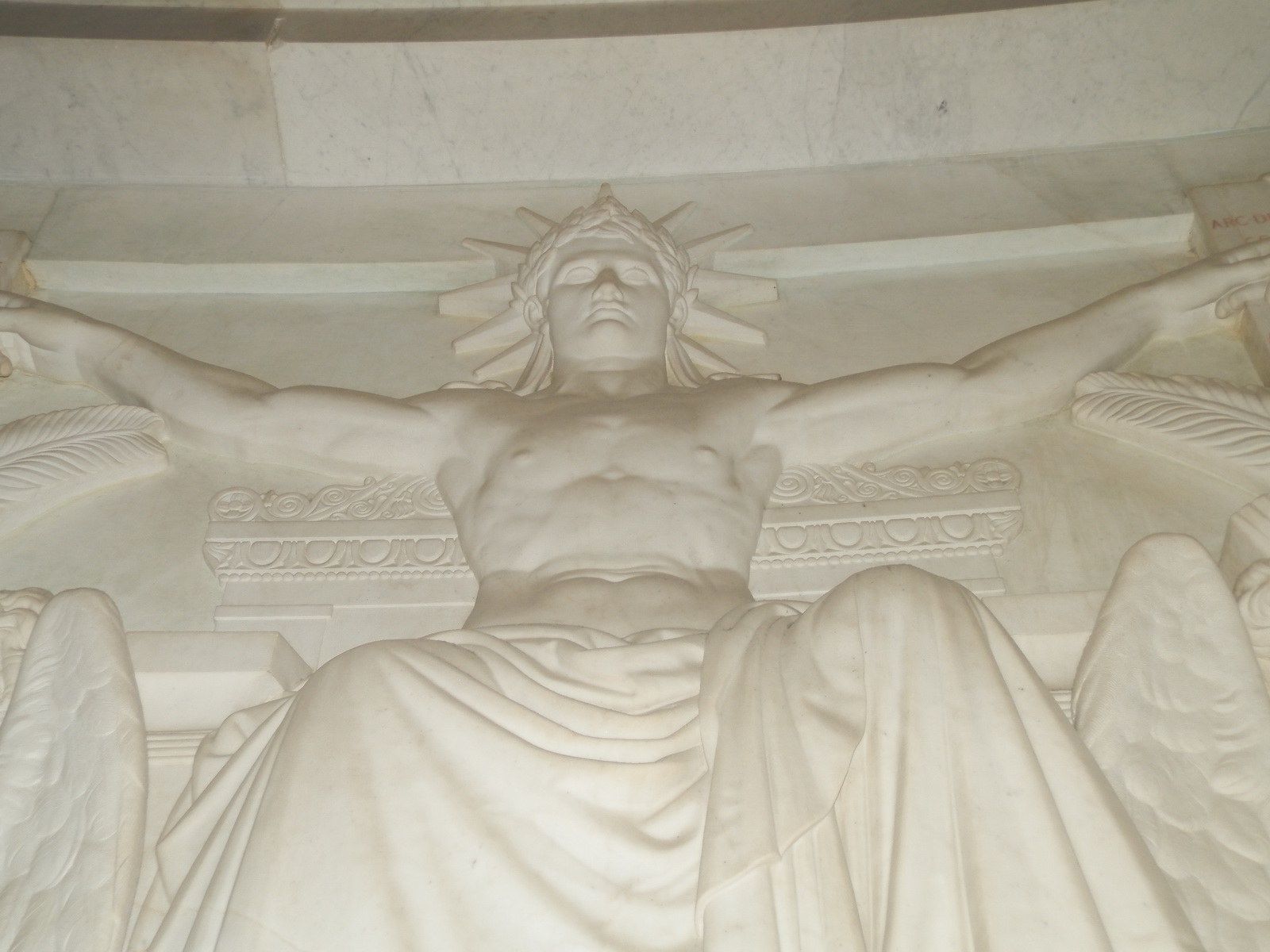 Napoléon idéalisé de manière héroïque dans 10 bas-reliefs décorant la crypte de son tombeau aux Invalides, elle pourrait presque sembler de l’époque romaine ou grecque avec les chlamys et les chitôns. Le bas-relief des travaux publics est mon préféré, l’empereur porte la couronne de lauriers triomphant surplombé d’une couronne rayonnante rappelant l’emblème du Roi Soleil ou encore celle de la statue de la Liberté. Le traitement du corps et du visage son traité de façons idéalistes classiques mais en y regardant de plus près on remarque les plis plus réalistes au niveau du nombril et du cou qu’on ne retrouverait pas dans des bas-reliefs grecs ou romain.